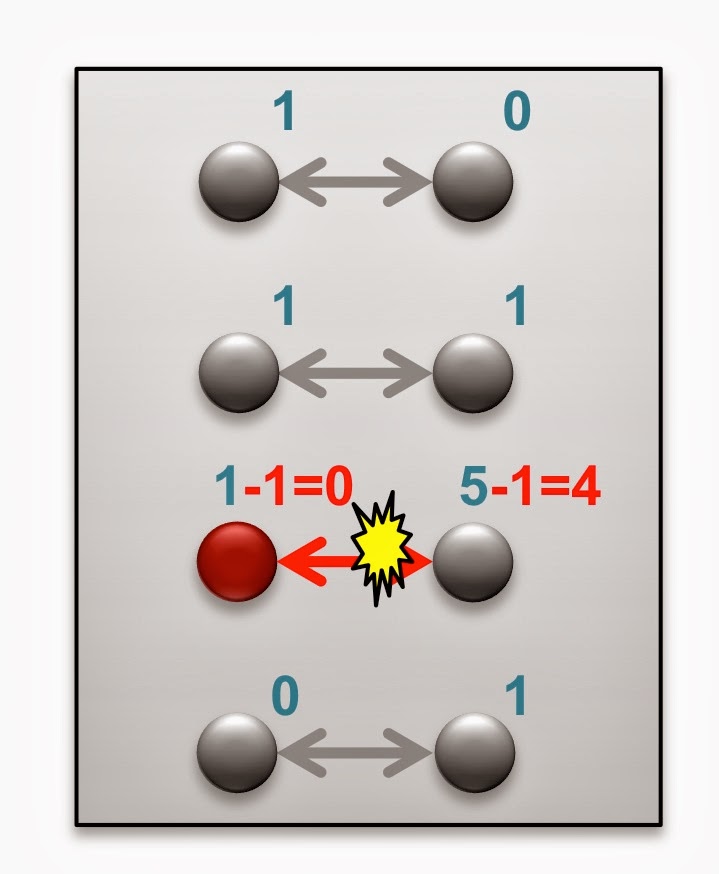 The greenish numbers are the fitnesses before the attack; while the red numbers indicate the results of the attack. The individual with Trait X (indicated in red) found the highest-fitness individual (5, in this case) and attacked him, reducing each of their fitnesses by one. But since the attacked individual still has fitness 4, there is a positive correlation between having Trait X as your partner and having high fitness. So the regression method calls this "altruism" when it clearly is not.